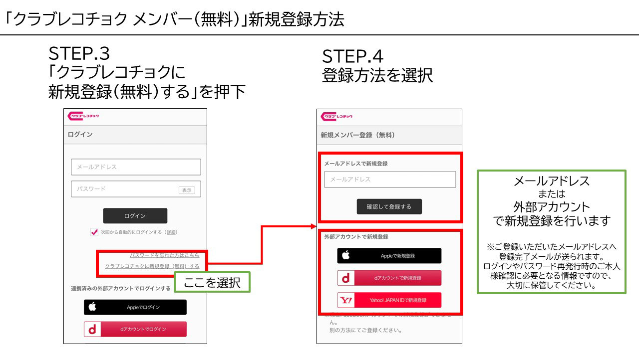 なお、クラブレコチョク登録時にはご登録いただいたメールアドレスへ登録完了メールが送られます。ログインやパスワード再発行時のご本人様確認に必要となる情報ですので、大切に保管してください。