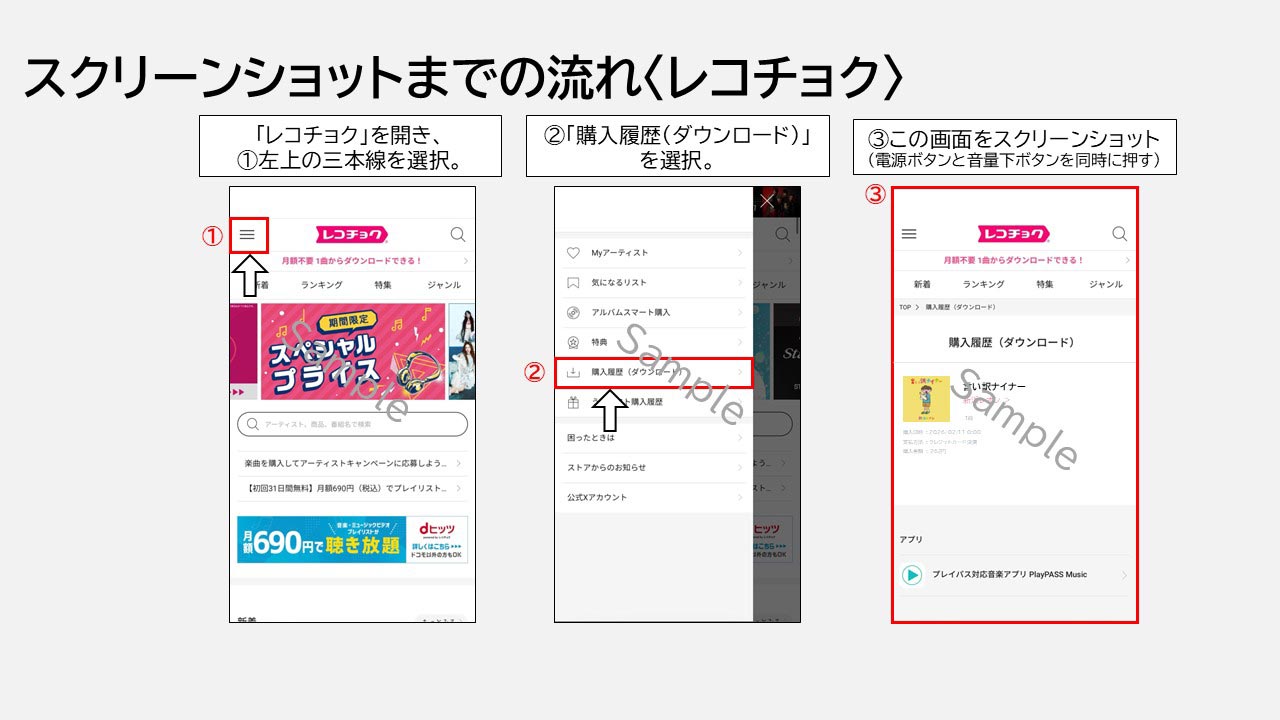 2.「購入履歴」ページより、対象商品がダウンロード済みであることが分かる画面のスクリーンショット画像を撮影する。